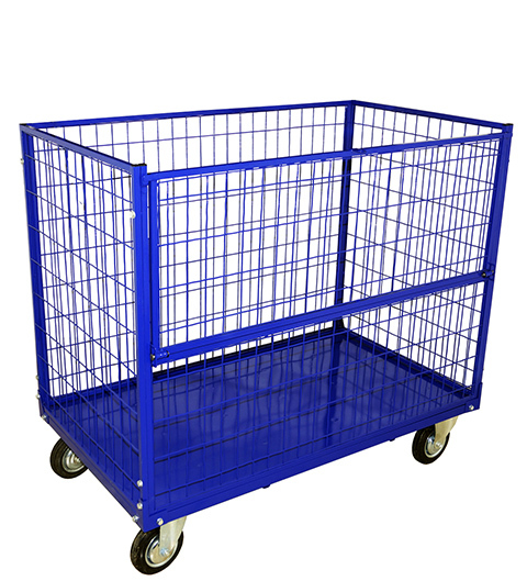 Контейнер цельносварной для складирования с направляющими под вилы погрузчика (125 х 380 мм) и проушинами под грузозахватные механизмы. Грузоподъёмность 800 кг. Установка КС вертикально друг на друга, с общей грузоподъёмностью не более 3,2 тонны. Уголок 40 х 40 х 4,0 мм, заполнение сетка с ячейкой 50 х 50 мм, платформа - лист 1,0 мм. Полимерная порошковая окраска позволяет работать на открытом воздухе при атмосферных осадках. Цвет – синий, RAL 5002.